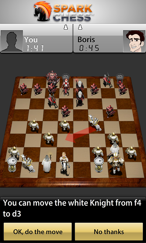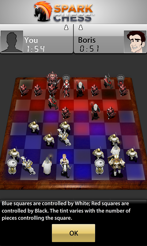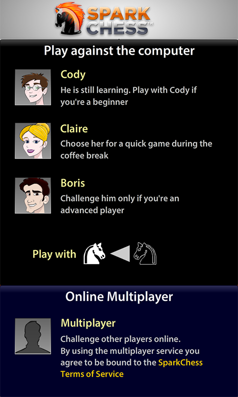 With SparkChess, there are no layers of menus to navigate or settings to check - -it's all right there on one screen. Choose black or white pieces, pick from three opponents of varying skill levels (beginner Cody, clever Claire, or masterful Boris), and start playing.